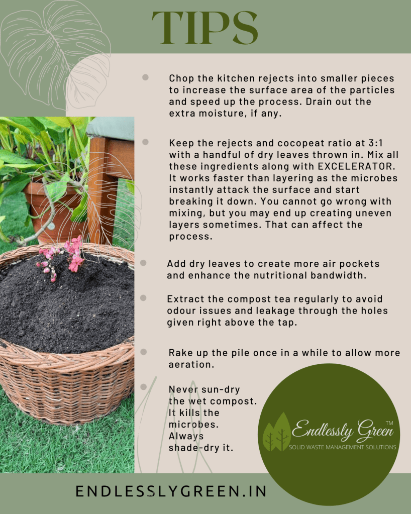 Spread a two-inch-thick layer of dry leaves followed by a one-inch-thick layer of Endlessly Green cocopeat at the bottom. Add a two-inch-thick layer of kitchen waste rejects on top of it. Now add another layer of cocopeat. Add a few handfuls of crushed dry leaves, if you have. Repeat the process until Eva is almost full. Always cover the top layer with cocopeat or dry leaves to prevent fruit flies from accessing the food waste. Refer to the TIPS box for more info.